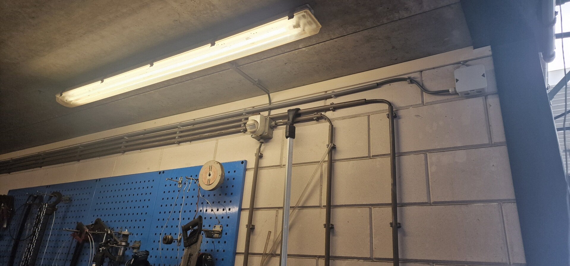 Voorzetwanden en wanden geplaatst om van een opslagruimte een kantoor te maken.